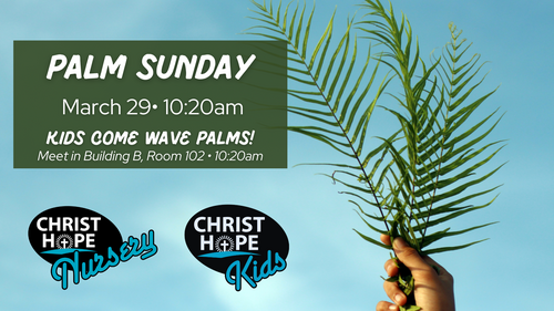 We invite children of all ages—babies through High School—to join us in the waving Palm Branch Parade at the beginning of our Worship Service on Palm Sunday. Meet in Room 102 at 10:20am for your palms. Let us welcome Jesus into our hearts!