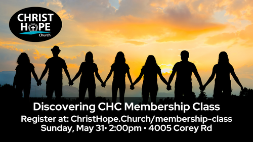 Are you interested in learning more about Christ Hope Church? Come to our 'Discovering CHC Membership Class! It's an opportunity to hear about CHC's mission, values, beliefs, what does it mean to be a member and ask questions. We gather in House 1 (4005 Corey Rd) at 2:00pm on Sunday, May 31 for this hour time together.