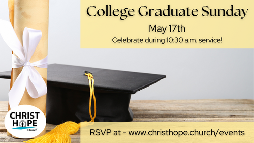 May 17th we want to celebrate all who are graduating college! College graduates will be recognized during the CHC main service at 10:30! We are so happy to see all that you have achieved and your bright futures that await.