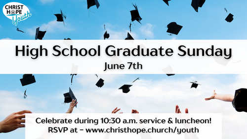 Congratulations to all our High School Graduates! We’re so proud of everything you’ve accomplished and excited for all that lies ahead in your journey. Join us for a special celebration on June 7th during CHC’s main service, followed by a family luncheon. To participate in the celebration, please RSVP in advance. We’re also creating a Graduate Highlight Table for each student—a space for you to share photos, awards, or items that reflect your high school journey.