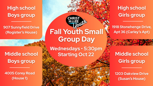 Christ Hope Youth is launching Fall Youth Small Group Day, starting on Wednesday, October 22 at 5:30 PM for all groups! These weekly meetings are designed to foster student community, grow faith through group study, and to have fun for both middle and high school. Small groups are organized by age and gender, with dedicated meeting spots & dates!