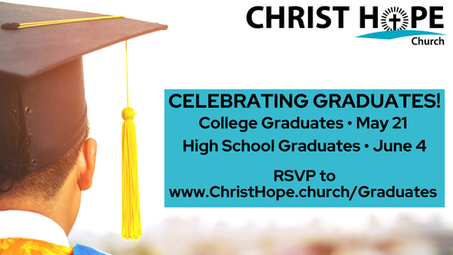 Christ Hope Church will be recognizing our college and high school seniors! College graduates will be a part of worship on May 21 and High School graduates will be celebrate on June 4. Please complete the form below and let us know if you are coming for lunch.
