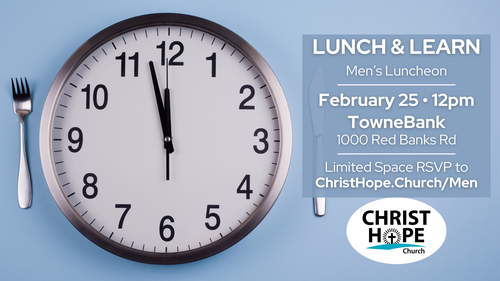Christ Hope Church is thrilled to host a special Men’s Luncheon on Wednesday, February 25 at 12:00 PM at TowneBank. Join us for a powerful afternoon of food, fellowship, and inspiration as Dennis Ross shares an encouraging message tailored just for men. Space is limited, so don’t miss out — RSVP today to reserve your seat!