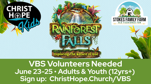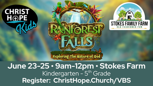 THIS SUMMER — June 23–25 — step into Rainforest Falls VBS! Kids will explore waterfalls, towering trees, and colorful creatures while discovering the wonder of God’s creation and what it means to stay rooted in His love.