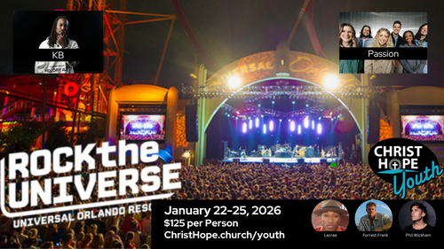 CHC Youth is headed to Rock the Universe at Universal Studios in Orlando! Join us for a weekend of thrilling rides, theme parks, and powerful worship concerts. We’ll be departing Thursday, January 22nd after school and return Sunday afternoon—please note, you’ll need to miss school on Friday.